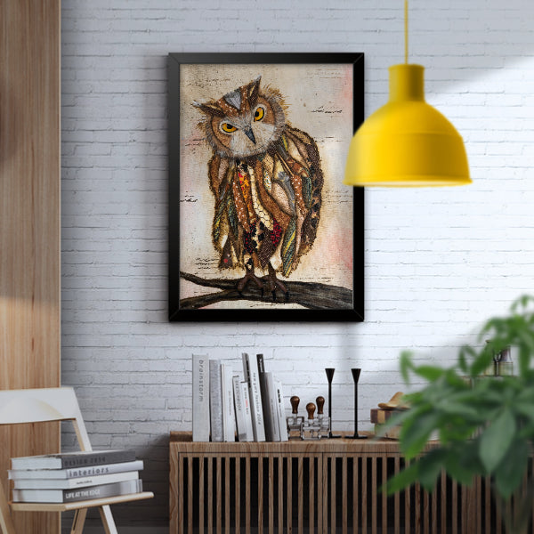 O print Coruja traz uma combinação de cores e texturas. Cada peça inclui um poster de alta definição no acabamento de sua escolha: poster, painel decorativo, moldura tradicional ou moldura filete, e ganchos para pendurar. A impressão é realizada em papel premium, garantindo qualidade excepcional.